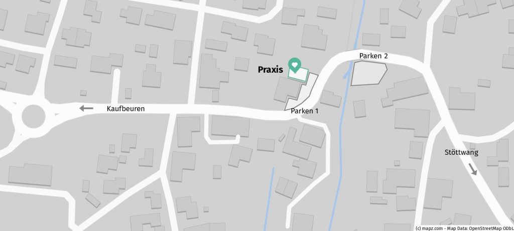 Von Kaufbeuren oder der B12 aus fährt man in Richtung Schongau. Das Arzthaus Stöttwang befindet sich im Ortsteil Thalhofen a.d. Gennach (kommt noch vor Stöttwang) und ist gut beschildert. Der Eingang ist ganz rechts, also an dem Kosmetikstudie entlang zu einem Seiteneingang.